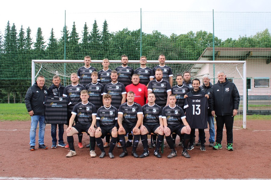 Mittlere Reihe von links: Guido Stommel (Fa. MWS) mit SVH-Vorsitzender Klaus Nohl bei der Übergabe des neuen Trikotsatzes für die Seniorenmannschaft.